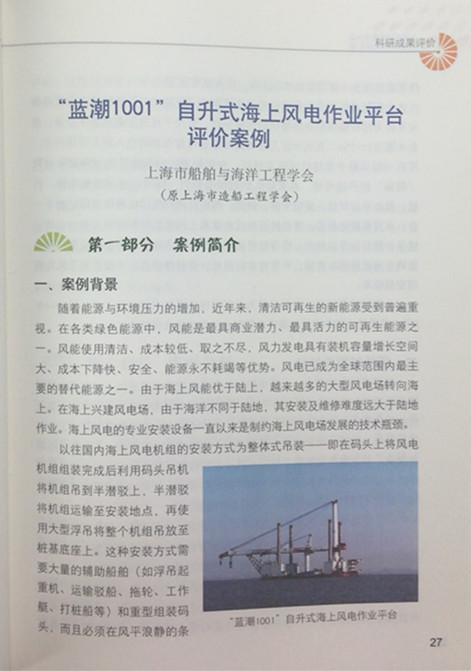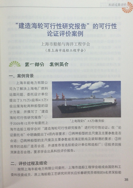 去年10月,我會按照上海市科協(xié)《關(guān)于征集科技評價典型案例的通知》精神,撰寫的“藍潮1001”自升式海上風(fēng)電作業(yè)平臺評價案例;集成式電液比例控制輕小型減搖鰭裝置評價案例;“建造海輪可行性研究報告”的可行性論證評價案例;“浙海521”50000t級散貨船評價案例4篇被收錄到《上海市科學(xué)技術(shù)協(xié)會科技評價案例匯編》一書。上海市科協(xié)期望能拋磚引玉,求得同行和專家的批評與建議,更期望能通過闡釋功能、梳理流程、規(guī)范體系,使所屬科技社團有所示范和借鑒,更好地為企業(yè)科技創(chuàng)新服務(wù)。